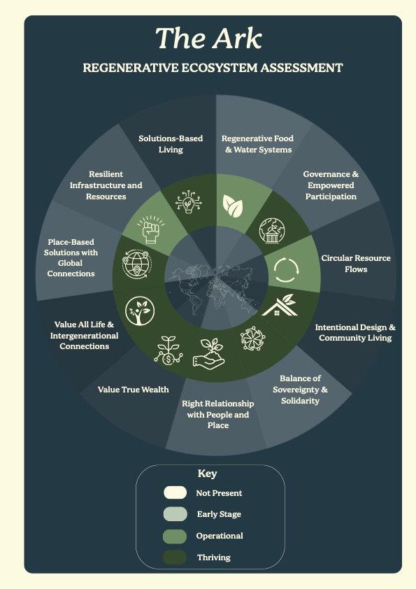 The infographic to the left is an example of the Regenerative Ecosystem Assessment by the RWQ from a real community in Costa Rica called The Ark. Here is the full case study on them as an example.
